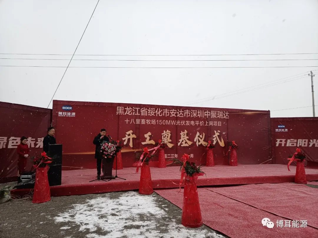 此次項(xiàng)This project is the fourth new energy power generation project developed and invested by Shenzhen Zhongju Ruida Industrial, a wholly-owned subsidiary of Boer Energy, in Anda City. Leaders of the Municipal Party Committee of Anda City, the People's Congress, the municipal government and relevant bureaus, the people's government of Yangcao Town, and the Anda Livestock Farm Co., Ltd. of Beidahuang Group were present at the scene and participated in the ribbon cutting and foundation laying ceremony.